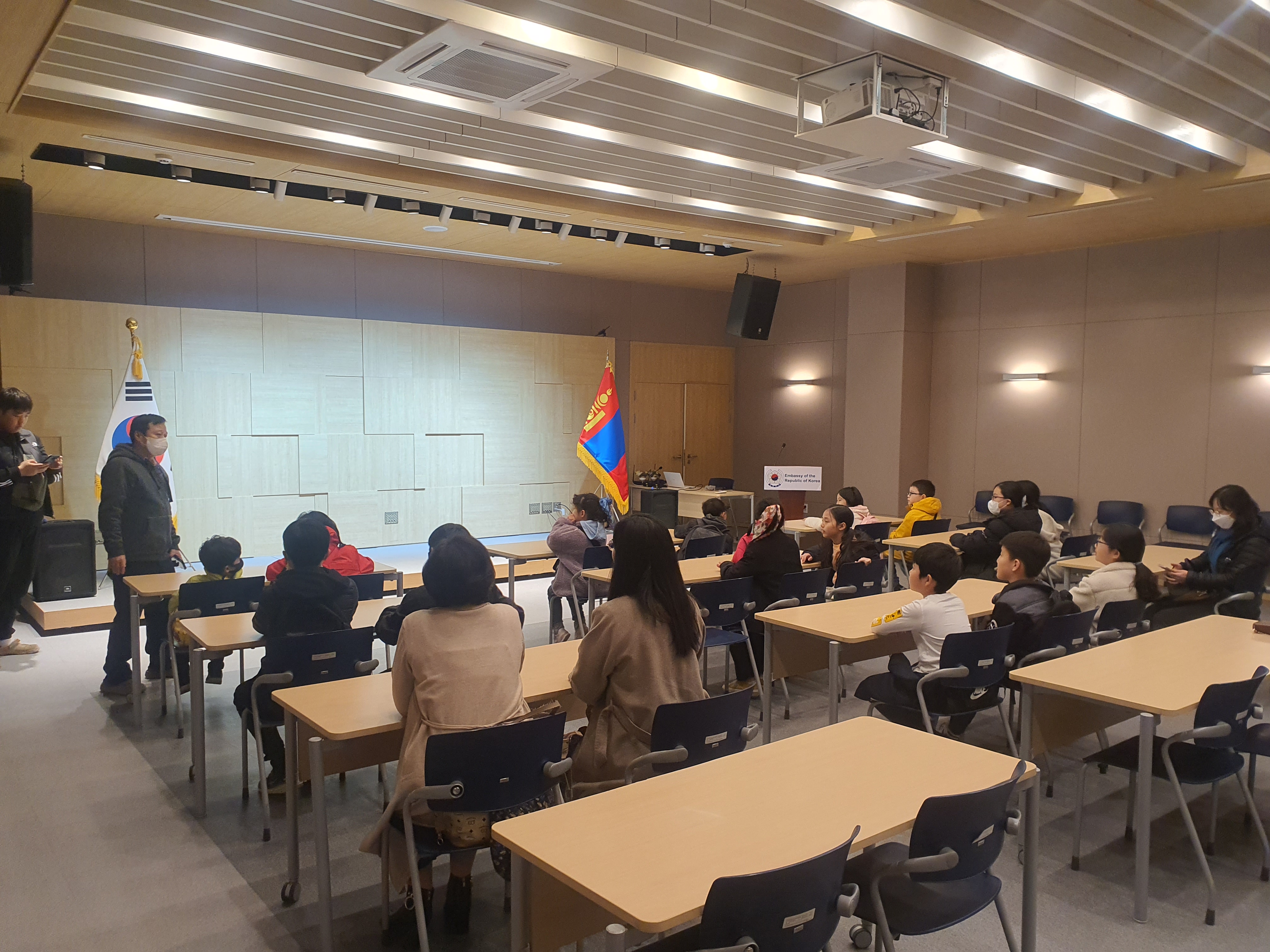 어린이 날을 맞이하여 대사관 방문하여 참사관님으로 부터 설명을 듣고 부채와 독도관련 자료를 선물 받았습니다.